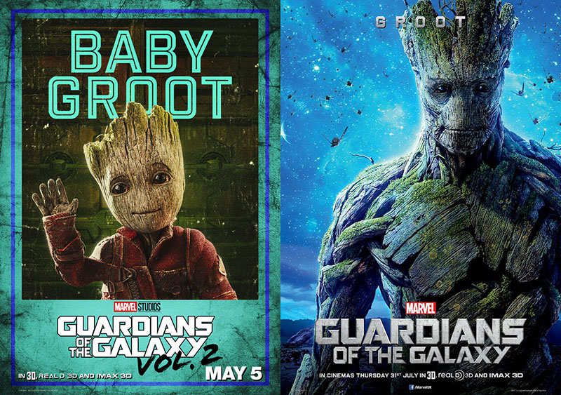 但還有一個更令女生喜愛,小時候我行我素(電影裡是重新活一次時),長大後堪稱最高級聖愚者的代表,就是 “星際異攻隊”哩,台詞永遠只一句I am Groot的樹人—Groot囉!